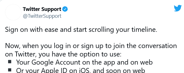 ٹویٹر سپورٹ کی جانب سے صارفین کو مطلع کیا گیا ہے کہ اب ٹویٹر اکاؤنٹ لاگ اِن کرنے کے لیے ایپل اور گوگل اکاؤنٹ بھی استعمال کیا جاسکتا ہے جبکہ ای میل ایڈریس ایک جیسا ہی ہوگا۔
